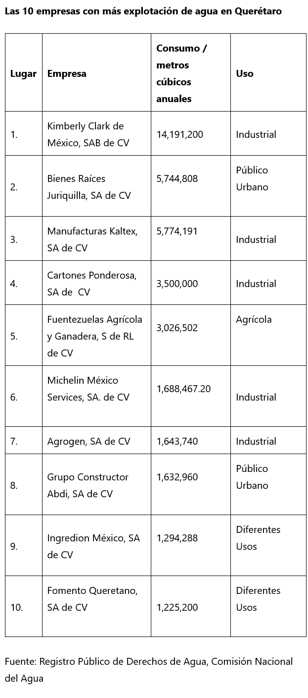 De acuerdo al reporte de Contralínea, Kimberly Clark, Manufacturas Kaltex, Bienes Raíces Juriquilla, Cartones Ponderosa, Michelín, Agrogen, Grupo Constructor ABDI, Fuentezuelas Agrícola, Ingredión México y Fomento Querétaro –vinculada a la refresquera Coca Cola– son las 10 empresas que más agua consumen en Querétaro, revelan datos del Registro Público de Derechos de Agua (Repda) de la Comisión Nacional del Agua (Conagua), con un uso anual de 39 millones de 721 mil 356 de metros cúbicos en total